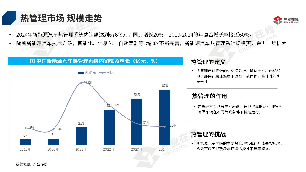 而得益于下游新能源汽车快速发展带动了热管理系统的规模增长,产业在线数据显示,2024年,中国新能源汽车热管理系统销售规模达771亿元。其中随着新能源汽车技术升级,智能化、信息化、自动驾驶等功能的不断完善,国内新能源汽车热管理系统规模预计会进一步扩大。据产业在线数据显示,2024年新能源汽车热管理系统内销额达到676亿元,同比增长20%。