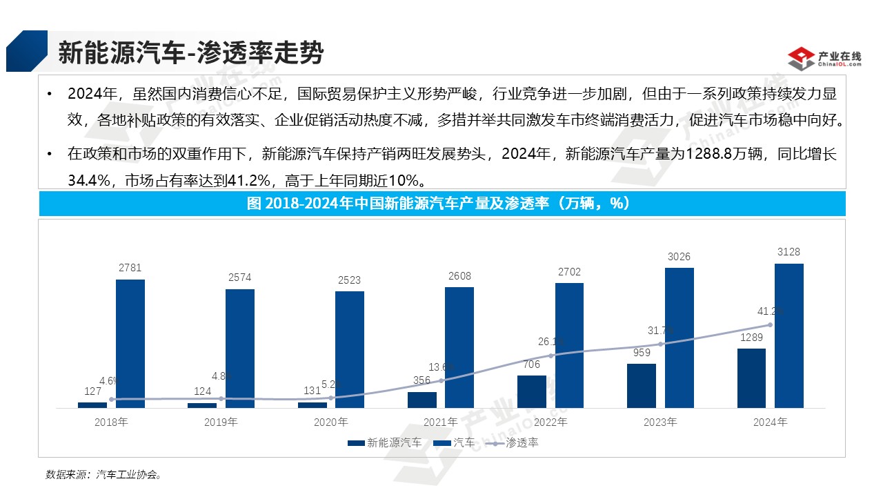 自2019年起,中国新能源汽车规模以每年近60%的速度增长,渗透率也逐年提升并于2024年达到41.2%,中国新能源汽车高速发展,产销总量已经连续9年稳居全球第一,连续三年占全球的70%。据汽车工业协会数据显示,2024年新能源汽车产销量、出口量均再创历史新高,全年产量为1288.8万辆,同比增长34.4%。